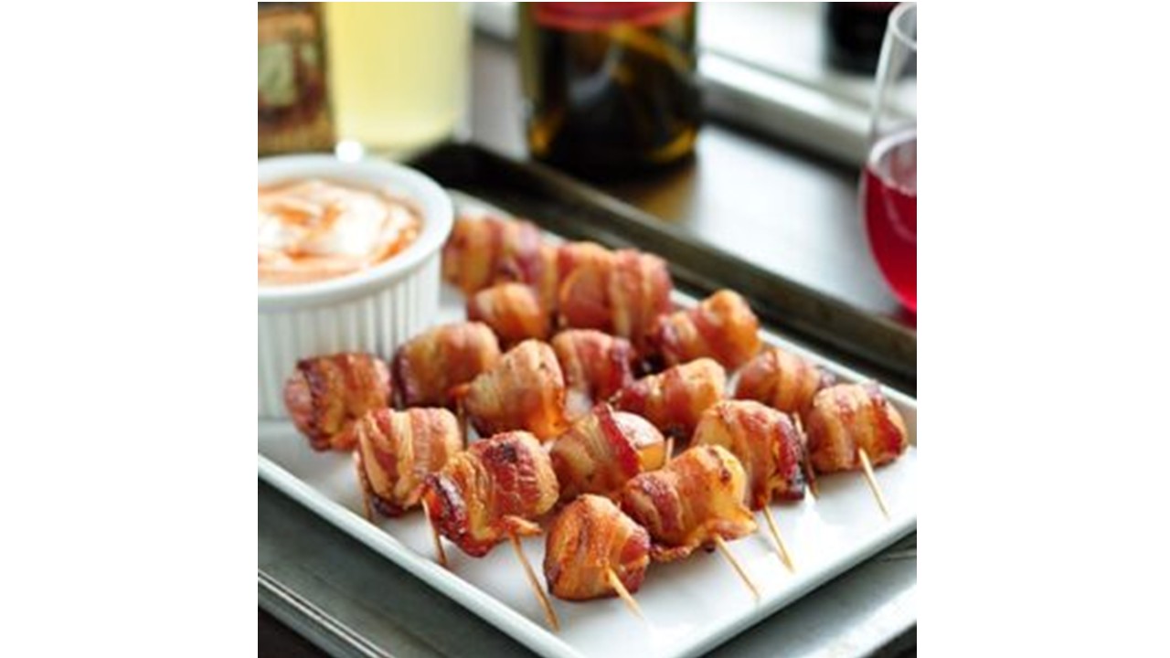 - Wrap each potato bite in a piece of bacon, securing it with a toothpick.
