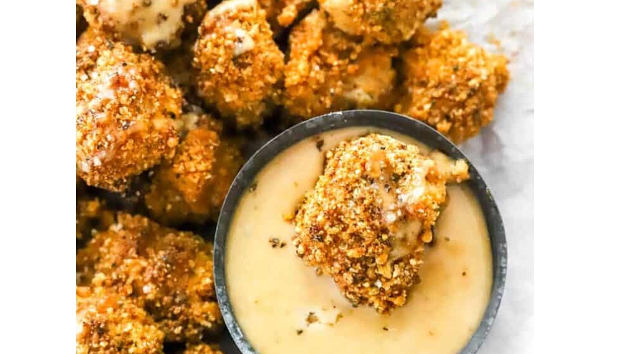 - Dredge chicken pieces in crushed pretzels, patting to adhere.
