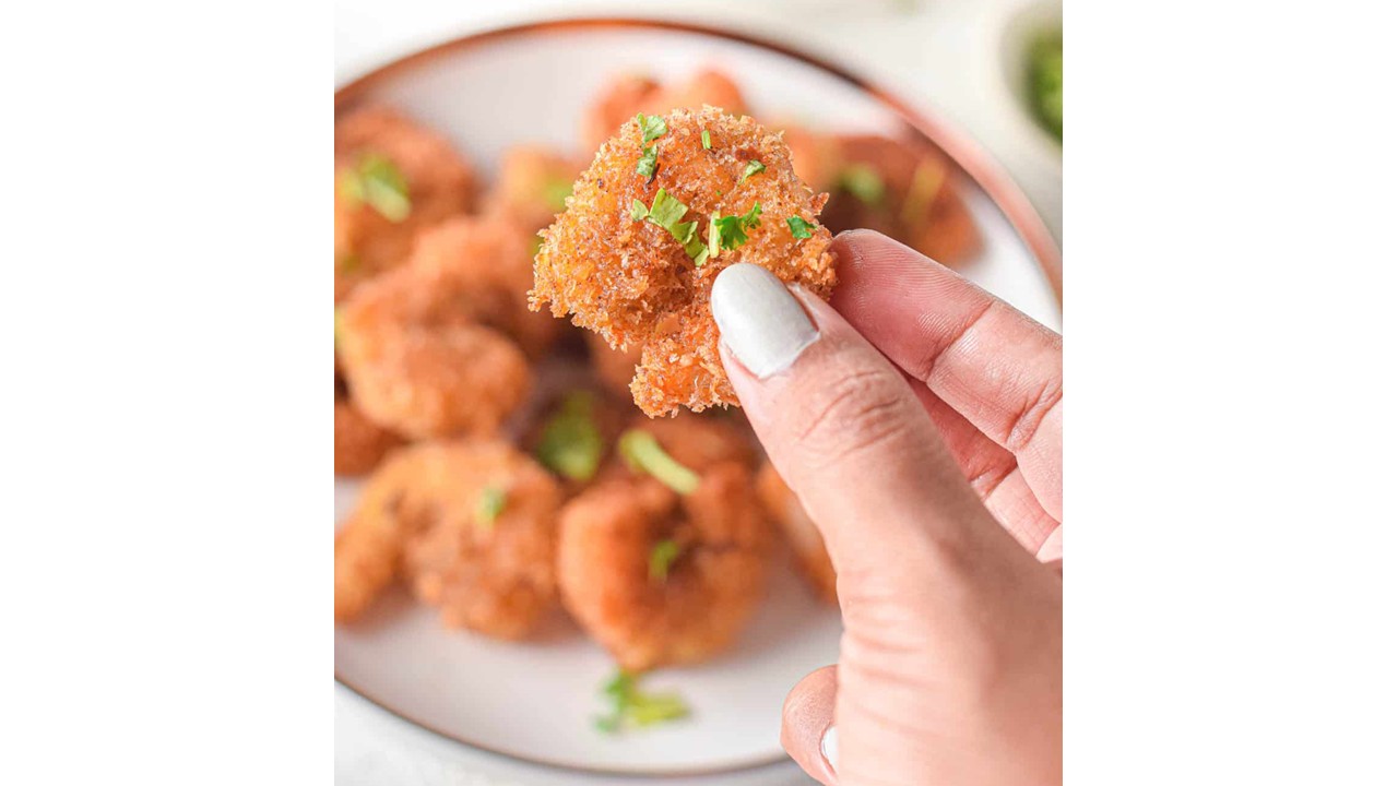- Working with one raw shrimp at a time, use a fork to dip the shrimp into the flour, shaking off any excess flour. Then dip it in the beaten egg mixture and coat it in the bread crumb mixture. Repeat the process for a second time to make it extra crunchy.
