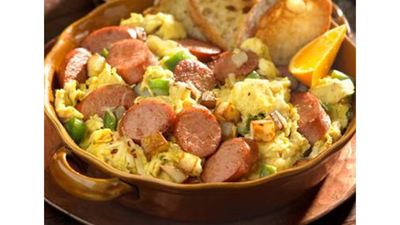 - Add sliced sausage and stir fry another 2 to 3 minutes. (If the skillet seems dry, add a tablespoon of olive oil before adding eggs).