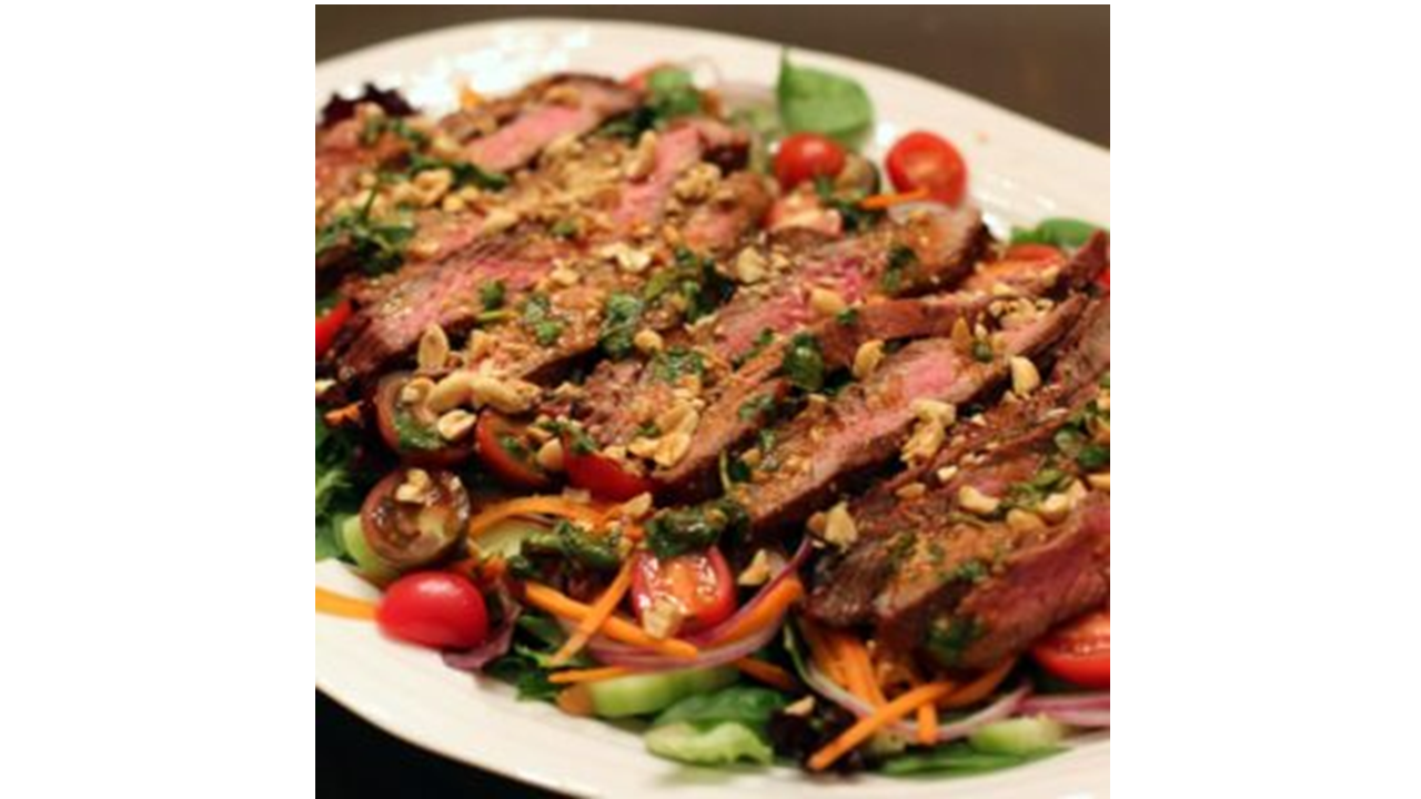 - Place your steak slices on top of the prepared salad and thinly drizzle with the reserved marinade/dressing. Add additional garnishes such as scallions, roasted unsalted peanuts, avocado, Thai basil or fresh mint.